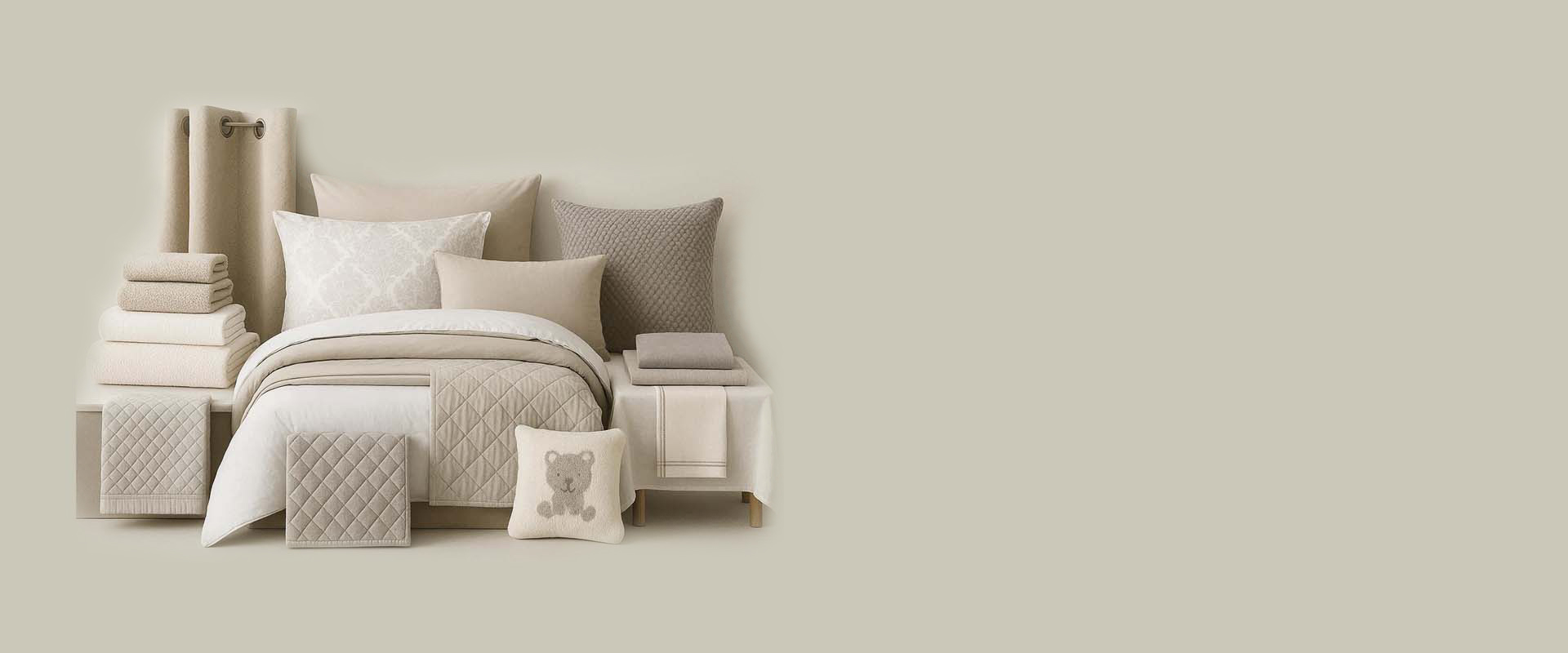 towels, bath mats, curtains, cushion covers, table linen, kitchen linen, and baby textile items. Fabrics include cotton