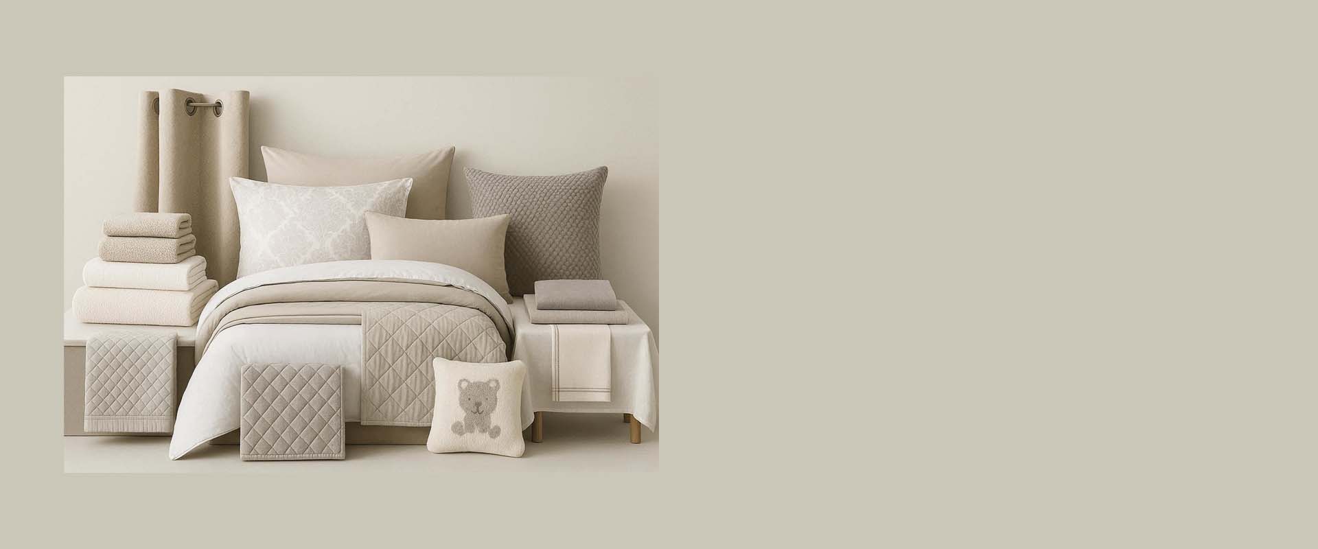towels, bath mats, curtains, cushion covers, table linen, kitchen linen, and baby textile items. Fabrics include cotton